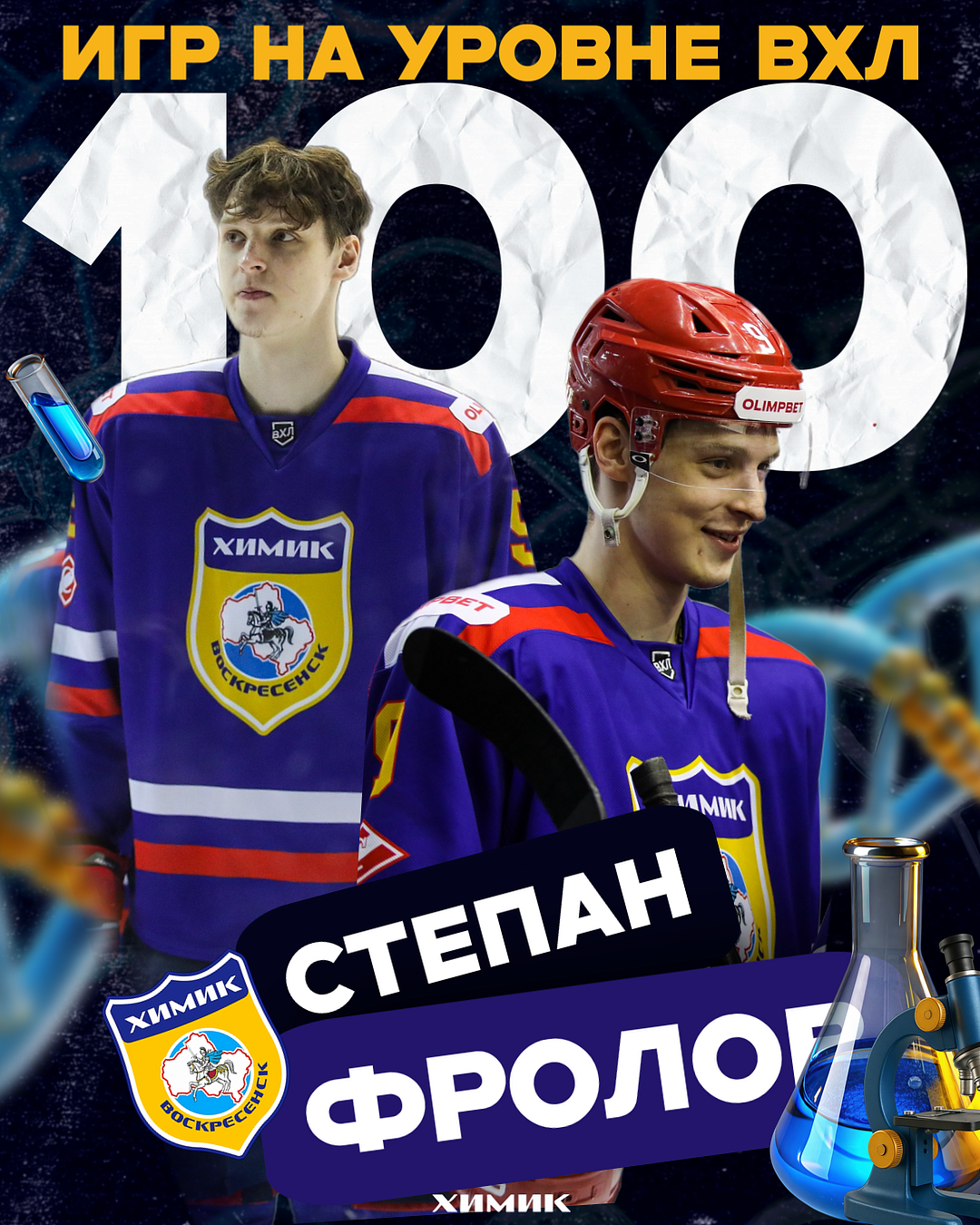 Степан Фролов в ходе своего второго сезона на уровне ВХЛ достиг отметки в 100 матчей. Все поединки он провёл, защищая цвета воскресенского «Химика» и набрал 8 очков по системе гол+пас (3+5). На счету игрока обороны 104 силовых приёма и 77 блокированных броска. Среднее игровое время – 13 минут 12 секунд.