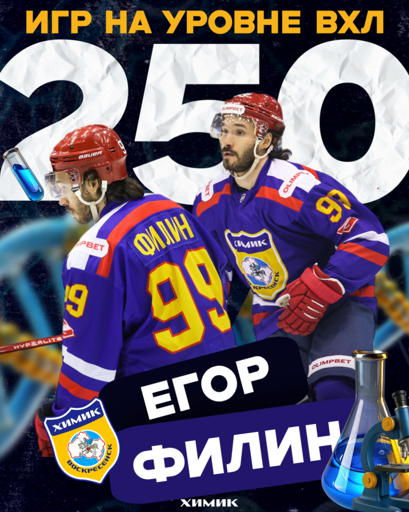 Егор Филин достиг планки в 250 матчей на уровне ВХЛ. В нынешнем сезоне форвард воскресенцев провёл 28 матчей, в которых набрал 21 очко по системе гол+пас, а игровое время составляет чуть менее 20 минут (19:48).