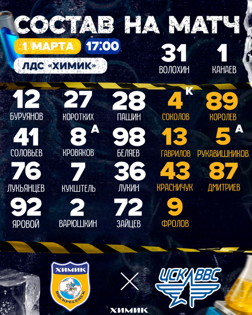 Центр четвёртого звена – Егор Варюшкин, на флангах Станислав Яровой и Алексей Зайцев. Для Алексея матч против «эскадрильи» будет всего третьим в календарном 2026 году.